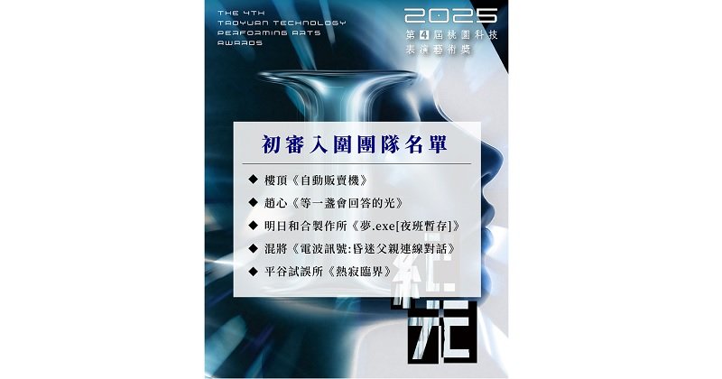 「第4屆桃園科技表演藝術獎於」已於11月4日辦理初審評選,共選出5組團隊進入複審階段,入圍團隊將於明(2026)年3月在桃園米倉劇場進行實地試演,競逐三大獎項,得獎作品也將於「2026 TAxT桃園科技藝術節」首演。