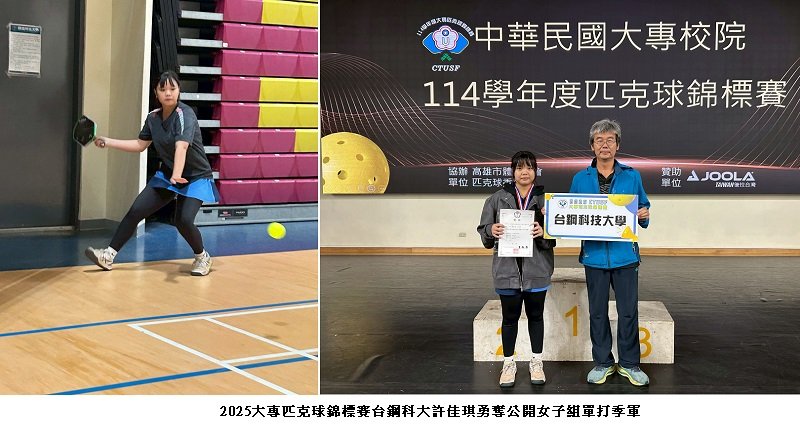 2025大專匹克球錦標賽於114年11月7日至11月9日在樹德科技大學舉行,共有來自全國24所大專院校,約300名優秀匹克球選手參賽,台鋼科大許佳琪參加公開女生組單打賽獲得銅牌,表現優異令人讚賞。