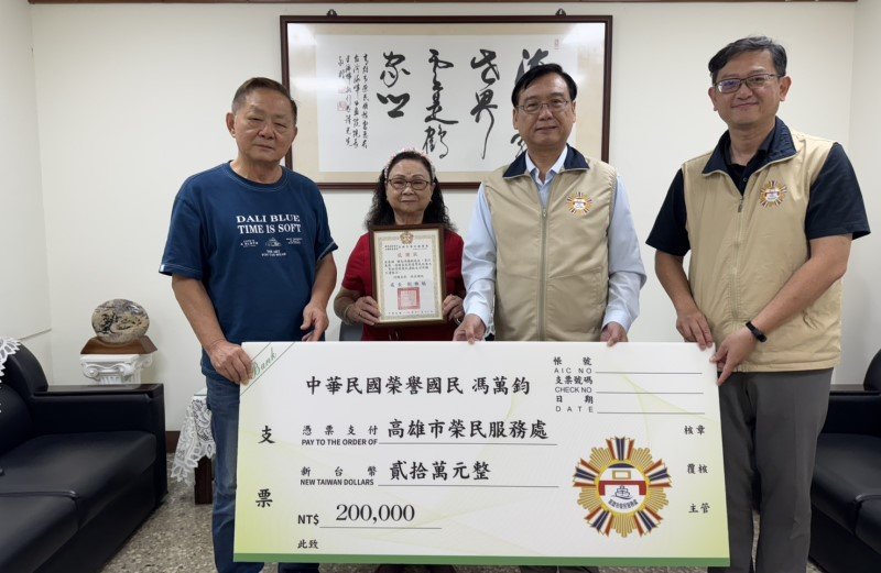 榮民馮萬鈞先生長期關懷弱勢榮民遺孤,自107年起持續捐助遺孤認養金。今年再度慷慨解囊,捐贈新臺幣20萬元,以實際行動回饋社會、支持遺孤照顧與教育工作,善心義舉令人感佩。