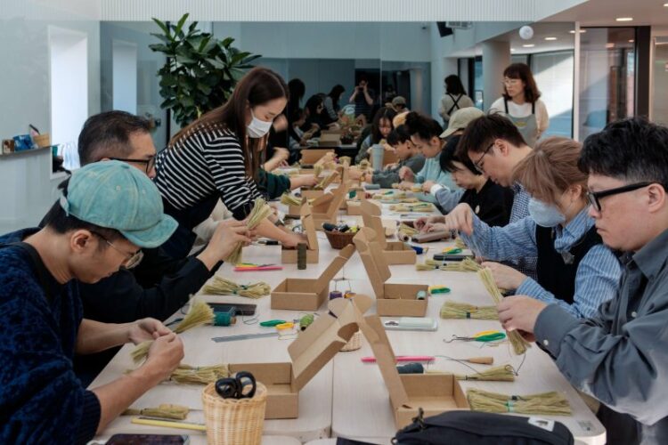 團隊並前往德安藝術村,觀察其以原有街區為場域、由藝術家與工藝師進駐所形成的「生活與創作共行」模式。藝術村以保留原有街區建築形式為基底,透過工作室營運與日常活動,形塑創作與生活共存的持續能量,展現場域如何成為工藝持續再生的文化能量來源。本次交流不僅呈現創作成果,更以手作實踐深化雙方連結,臺灣工藝師於德安藝術村參與由韓方工藝師指導的苧麻小掃把編製課程,從纖維分束、收攏到固定節奏,體會韓國日常工藝背後運用的材料思維與觀點。另一方面,臺灣工藝師亦在藝術村舉辦藍染與框織卡片工作坊,開放社區民眾參與,透過經緯線交織、折疊綁紮與染色作業過程,參與者以自身的手勢與感知在纖維上留下獨特紋理,讓工藝在互動中回應生活,也在生活中被重新理解。