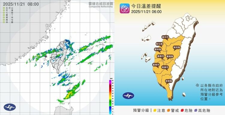 溫度方面,週五清晨各地低溫約17度至19度,局部溫度將會再更低一些,白天高溫北部及宜蘭約22度、23度;花東約24、25度;中南部約26度、27度,早晚請多加注意保暖。離島的澎湖為陰時多雲,約20至22度;金門為多雲,約15至20度;馬祖為晴時多雲,約14至17度。