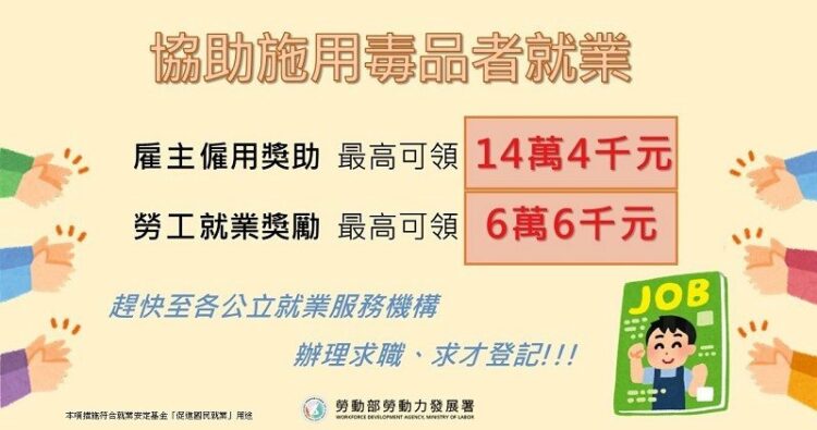 另外為了鼓勵雇主能夠釋出友善的職缺,只要僱用經公立就業服務機構推介的施用毒品者,僱用每滿10日就可以申請獎助津貼,累計最高可以申請14萬4,000元,高分署也歡迎願意提供職缺的友善雇主加入計畫的行列,攜手協助想要重獲新生的藥癮者穩定就業。詳情請洽高屏澎東分署就業中心或撥打免付費專線0800-777888。