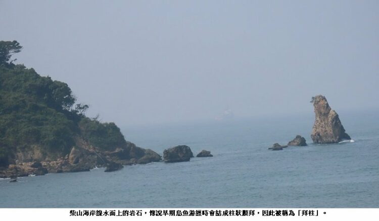 他們的說法是洄游性的烏魚游經這片海域時,經常在岩石附近結成柱狀停留,好像是在膜拜這些岩石,所以,岩石被漁民尊之為「拜柱」。這些岩石現今都還在,但己經數十年沒看過烏魚在此結柱膜拜了,所以,「拜柱」這個形容詞只留在耆老的聽聞中。