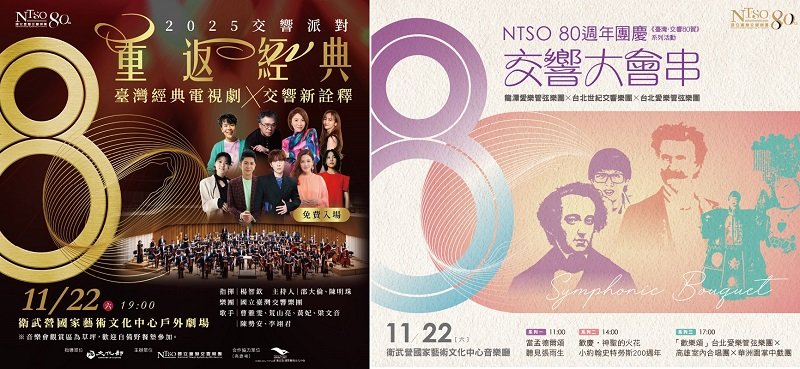 NTSO國立臺灣交響樂團自 11 月 21 日至 22 日在衛武營國家藝術文化中心推出80週年系列活動,一連兩天由音樂廳延伸至戶外劇場,共帶來5場正式音樂會及1場校園團隊演出。節目包含《水藍,陳毓襄與國臺交》、3場《交響大會串》、《我的音樂伸展台》,以及壓軸戶外節目《NTSO交響派對—重返經典》,呈現跨場域、跨世代、跨樂種的多層次藝術風景,邀請民眾以各種方式走進音樂,與國臺交一同慶祝 80 週年。