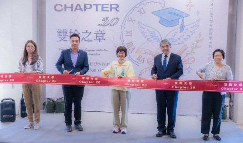 圖/文藻外語大學22日舉辦「外語教學系第20屆畢業成果展」,教育部蔡清華前政務次長(右二)、高雄市李喬如議員(中)、外教系周牧璇主任(右一)、公關室林裕展主任(左二)、外教系畢業展總指導老師陳佳吟為開幕式剪綵。