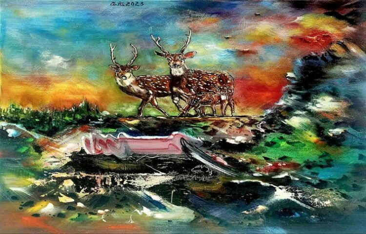 然而,隨著生命經驗的累積,他的畫風也逐漸蛻變。他帶著我走到另一批近期創作的抽象畫前,畫面上不再是具體的山川草木,而是流動的、虛幻的色塊與線條,彷彿是宇宙初開的混沌,或是星雲生滅的瞬間。「這些年,我更多是在畫『感覺』,畫宇宙的飄渺,畫內心的靈性風景。」他解釋道。看著那些作品,我確實感覺自己被吸入另一個時空,色彩與線條編織出的幻想世界,讓人暫時忘卻了現實的紛擾。