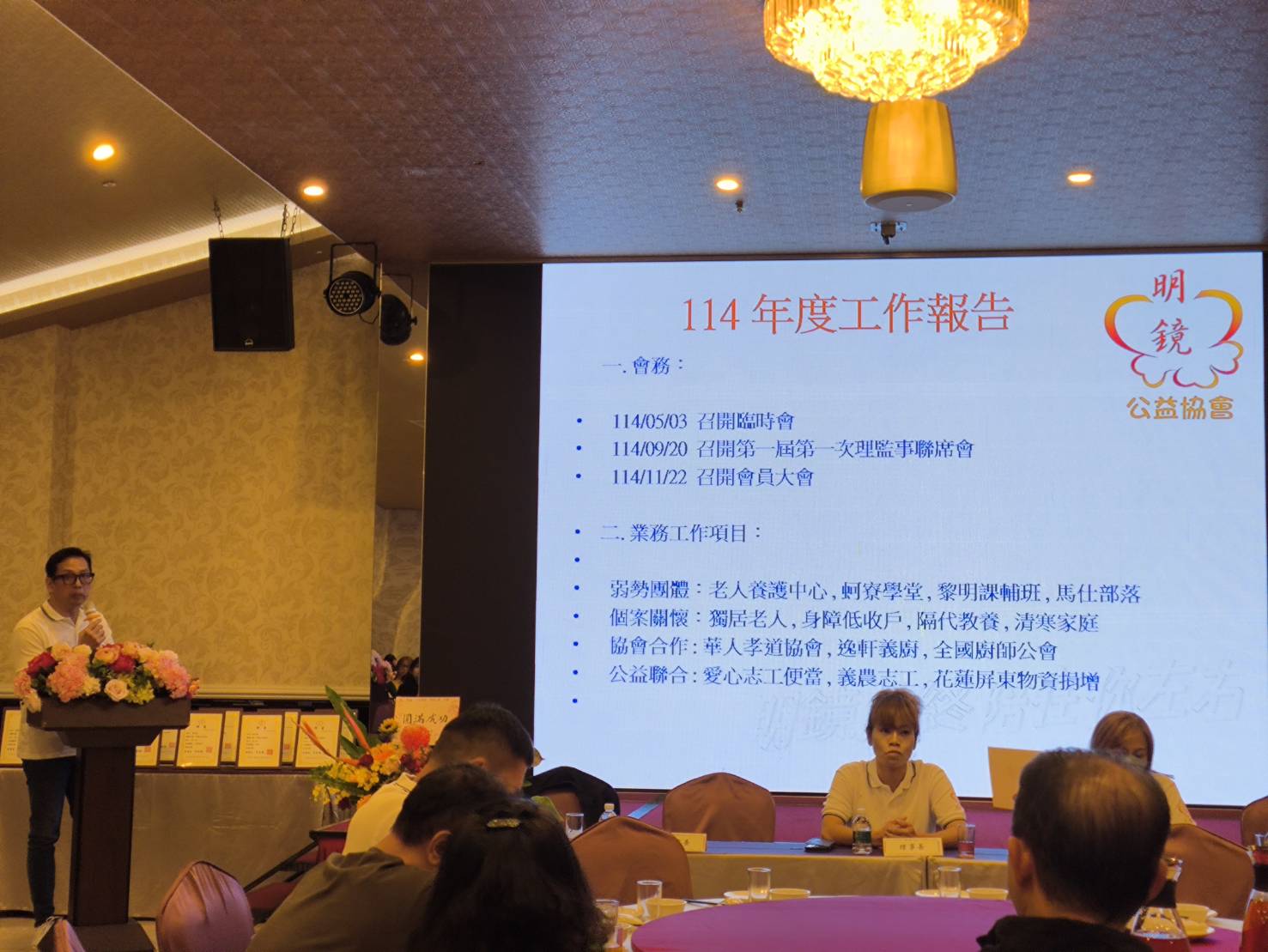 明鏡公益協會於(22)日在鳳山和樂餐廳舉辦「第一屆第二次會員大會」,由理事長李茹憶帶領會員齊聚一堂,共同回顧年度服務成果並展望未來方向。協會秉持「初心、善心、正心」三顆心為核心理念,珍惜並善用每一位愛心人士所付出的資源,落實「取之社會、回饋社會」精神,用行動凝聚力量,溫暖那些最容易被忽略的角落。