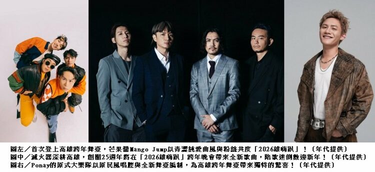 高雄市政府今(24)日公布跨年晚會新一波卡司,集結國民天團「滅火器」、超人氣樂團「芒果醬Mango Jump」,以及火力滿點的「Ponay的原式大樂隊」接力演出,市長陳其邁表示,高雄是舉行「大港開唱」等指標音樂祭的聖地,跨年當然少不了臺灣在地樂團一起嗨,今年力邀三種獨特風格的人氣樂團接力,喊話「聽團仔」跨年夜到夢時代集合,在音浪中迎接美好的2026年。