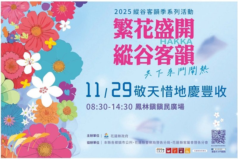 花蓮縣政府主辦的「2025縱谷客韻季系列活動」,今年最終場「敬天惜地慶豐收」將於11月29日(六)在鳳林鎮鎮民廣場熱鬧登場。活動以客家傳統祭典為核心,象徵客家族群在歲末年終為一整年農事畫下圓滿句點,並祈求來年風調雨順、五穀豐收;今年特別安排多元表演與精采節目,邀請鄉親一同感受客家信仰與文化內涵。