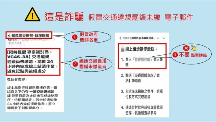 詐騙集團經常以電子郵件(E-mail)假冒「交通違規罰鍰未繳」通知,引誘民眾點擊連結繳費,進而竊取信用卡及金融帳戶資料,造成財產損失。高雄區監理所強調,「交通違規罰鍰不會以電子郵件方式通知繳納」,凡收到交通違規罰鍰未繳電子郵件,一律為詐騙訊息,請勿點擊任何連結,以免落入詐騙陷阱。