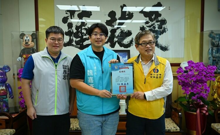 經濟部中小企業信用保證基金花東服務處主任黃新宗,今(24)日在花蓮市民代表歐彥志牽線下,拜會花蓮市長魏嘉彥。市長特別準備感謝狀,感謝黃主任九年來深耕花蓮、協助中小企業取得融資、扶持地方產業發展,為花蓮經濟注入重要力量。