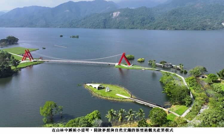 這次榮獲美學與景觀類首獎的大埔鄉和平社區音樂饗宴暨大地療育設施改善工程,以「音樂」、「自然」、「療癒」為核心,將小提琴工藝、音樂教育與在地湖畔景觀整合,打造沉浸式的地景與展演空間。工程以「小提琴」為主題發想,設置琴頭入口意象、指板橋面、鋼琴鍵欄杆、地景琴橋及音孔療育設施,使整個場域成為可親近、可體驗的音樂地景。