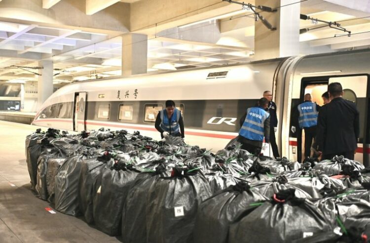 圖/漢口站月臺上,鐵路工作人員正將包裹搬進高鐵車廂。京報網提供