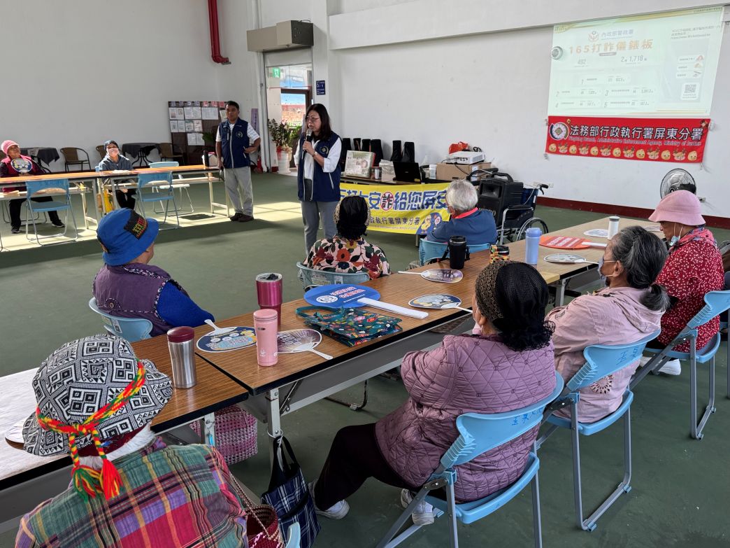 為落實法務部行政執行署推動的「五打七安」專案,強化偏鄉長者的防詐意識,屏東分署近日持續深入偏鄉部落,將法律知識與反詐資訊帶進社區。柯分署長怡如特率領同仁前往瑪家鄉三和村活動中心及轄內日照中心,透過實例分享與情境說明,協助長者建立正確的防詐觀念,避免因資訊落差而成為不肖分子的目標。