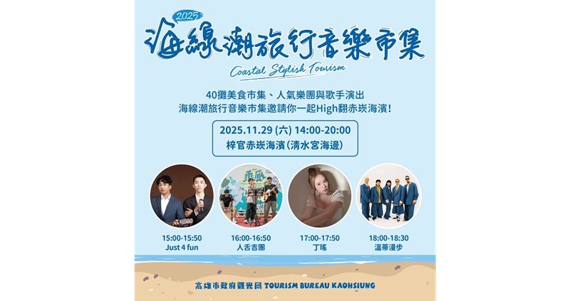 繼上週彌陀「高雄海線探險趣」獲得遊客與在地鄉親熱烈迴響,高市府觀光局本週六(11/29)下午2點到晚上8點在梓官赤崁海濱,再度推出每年叫好叫座的海線潮旅行音樂市集;共計41攤特色美食,以及曲風多元的「溫蒂漫步」、歌聲療癒的「丁瑤」、「人舌吉團」及「Just 4 fun」等4組音樂團體演出。活動當天還可現場報名「赤崁聚落導覽」遊程,參加即贈100元市集券及梓官區漁會「烏魚子口味米乖乖」乙包。歡迎民眾一同來逛離海最近的市集,吹海風、賞夕陽、聽音樂、嘗美食,感受海線漁村的獨特魅力。
