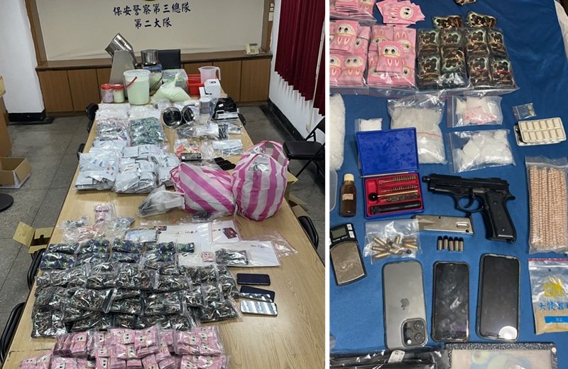 保三總隊於今(114)年6月間偵辦毒品咖啡包販毒案時,向上溯源鎖定關鍵成員身分,並於今年8月及11月間執行搜索,在臺南市永康區查扣安非他命、愷他命、卡西酮等毒品原料、混合式毒品咖啡包與彩虹菸、手槍及子彈等違禁物品,全案依《毒品危害防制條例》及《槍砲彈藥刀械管制條例》等罪嫌移送偵辦,成功阻斷一個毒品製造源頭及非法槍彈危害社會。