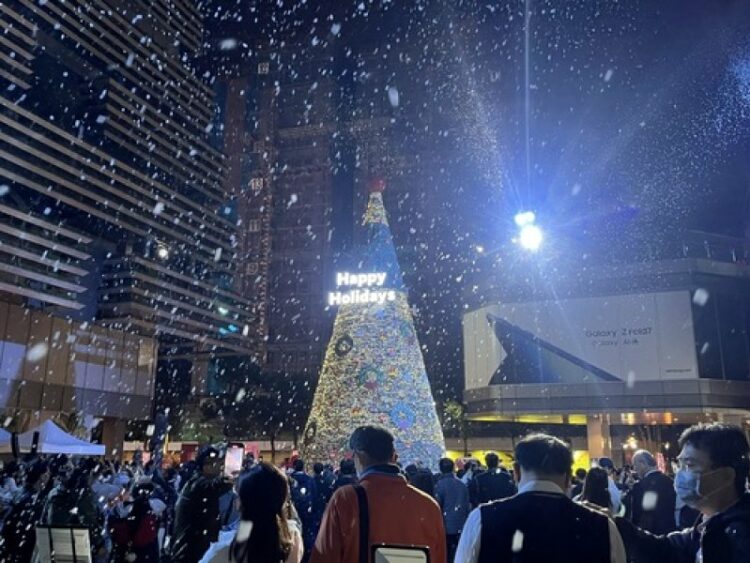 聖誕樹點亮則於6時30分登場,推出約3分鐘的燈光秀,搭配雪花機製造雪花飄落的冬季景觀,相當浪漫,吸引許多顧客駐足打卡留念。