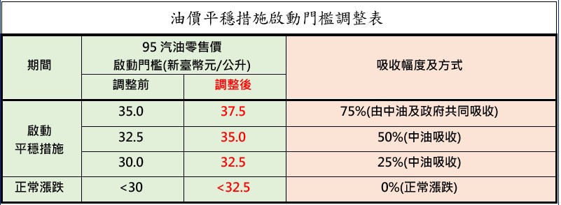 鑑於近期國際油價未來將持續維持俄烏戰爭以來低檔,另主計總處預估我國今年CPI年增率維持在2%以內,顯示國內物價趨於穩定。為使國內汽柴油價格更符合市場機制的精神、並落實使用者付費的公平原則,自12月1日起微調「亞鄰最低價限制」,排除亞鄰國家政府補貼供油商造成油價失真的因素,另外平穩措施啟動門檻亦各調高一個級距(如附表)。