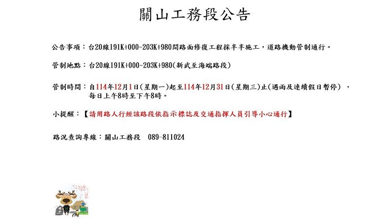 公路局南區養護工程分局為辦理「台20線191K+000~203K+980間路面修復工程」,(臺東縣海端鄉新武~海端),將於114年12月1日(星期一)起至114年12月31日(星期三)止(遇雨及連續假日暫停),每日上午8時至下午8時路面刨鋪及標線施工,施工期間原則採半半施工,惟施工路段因受限路幅寬度不足及機具作業所需,部分路段短時間將採單線雙向輪流放行方式管制交通,請用路人行經該路段依指示標誌及交通指揮人員引導小心減速慢行。