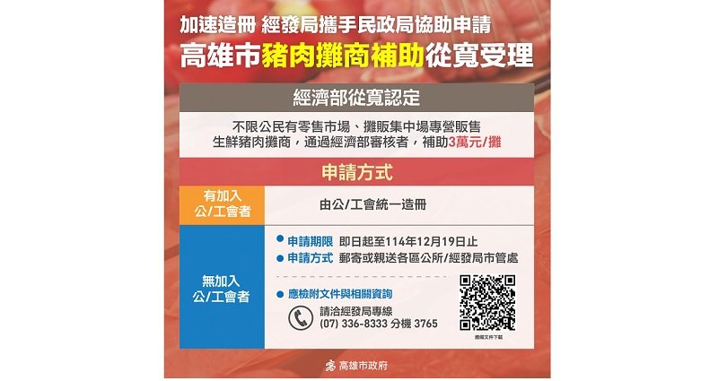 高雄市政府經發局指出,高市市場及攤販集中場範圍外之生鮮豬肉攤商,如有加入高雄市直轄市家畜肉類商業同業公會、高雄市家畜肉類商業同業公會、高雄市屠宰業職業工會及高雄縣屠宰業職業工會會員者,將會由公/工會統一造冊,送交經濟發展局彙整後轉請經濟部審核。沒有加入公/工會的生鮮豬肉攤商,則採個案方式受理申請,請申請人以郵寄或親送區公所或者經發局方式,向經濟發展局市場管理處提出(地址:802721高雄市苓雅區四維三路2號,經濟發展局市場管理處收),信封請註明「非洲豬瘟生鮮豬肉攤商補助申請」,申請期限至114年12月19日止,以郵戳為憑,後續經市府造冊並通過經濟部審核者,每攤補助3萬元。
