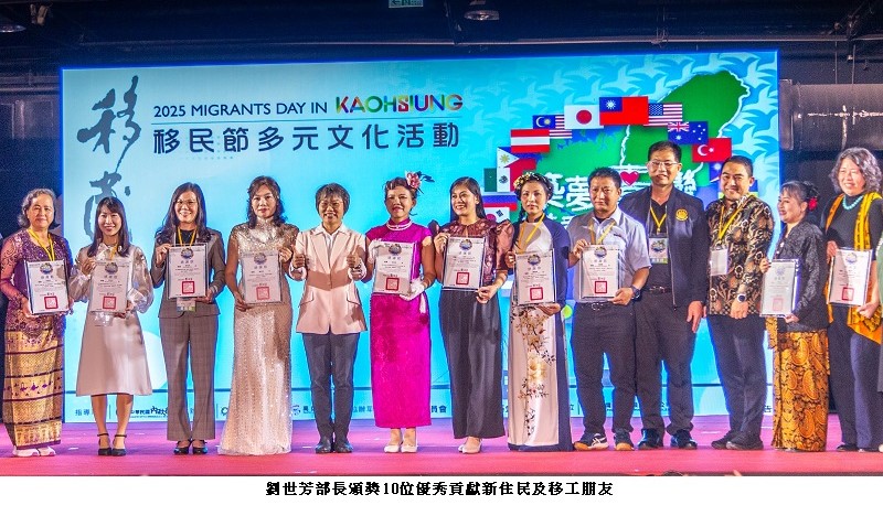今日活動現場亦同時表揚10名優秀新住民及移工,國籍多元且遍佈各行各業,包括長年於高雄旗津關懷外籍漁工,提供免費通譯服務的印尼新住民洪秀鸞;也有從害羞內向,到現在參與多部電視劇及舞臺劇演出的越南新住民陳秋柳;另有在臺努力工作屢獲肯定的模範移工泰國籍楊國俊先生及菲律賓籍雷卓女士等,感謝他們在家庭、職場及社會中的付出與貢獻,因為他們的努力,臺灣更加美好,也讓世界看到臺灣。