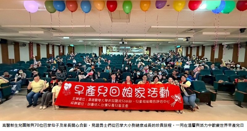 為迎接「世界早產兒日」(11 月 17 日),高雄醫學大學附設中和紀念醫院(簡稱高醫)今(30)日特別邀請 70 名早產兒與家人回院參加一年一度的「回娘家」活動。高醫新生兒科每年照顧超過 200 位早產兒,在團隊完善照護下,這群「巴掌仙子」得以健康成長。今年活動以蛇年為主題,舉辦「蛇prise!小腳丫大集合!」,邀請 2020 年 1 月至 2023 年 7 月出生、目前 2 至 5 歲的早產兒家庭熱情參與。