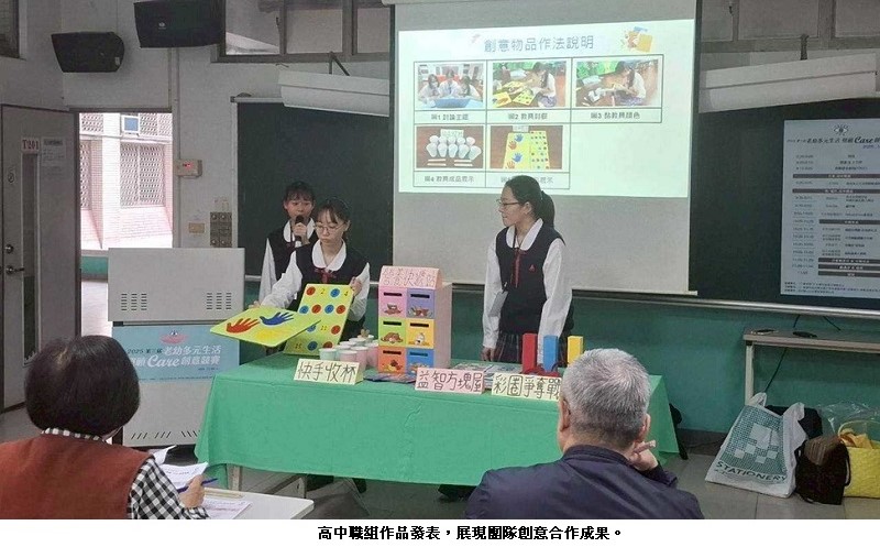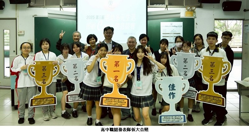 高中職組表現同樣亮眼。稻江高級護理家事職業學校幼保科「花花園藝闖關大作戰」榮獲創意物品組第一名;樹德家商「巷弄長照柑仔店—青銀共融互動之探討」與稻江護家「福氣滿滿大挑戰」獲第二名,華南高商「織竹樂」與五育中學「戲遊台灣趣-長幼遊玩去」則分居第三名,永春高中也以作品「你擁抱我知道」獲佳作,各隊伍皆展現文化創意與互動設計的融合特色。