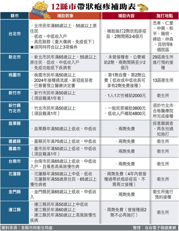 目前國內有12個市縣有補助民眾施打疱疹疫苗(見附表)。李雅芬指出,陳市長是公衛專家,了解皮蛇對人體影響,要求市府也要訂定補助辦法,給於弱勢族群適當補助。
