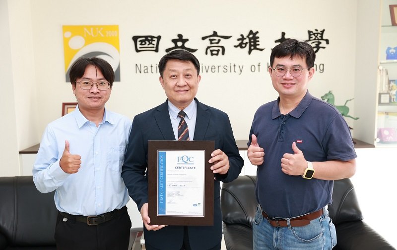 圖/高雄大學通過ISO 50001認證,校長陳啓仁(中)、總務長陳怡凱(右)、總務處組長朱進宏共同展示證書。