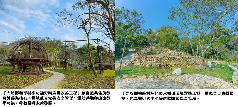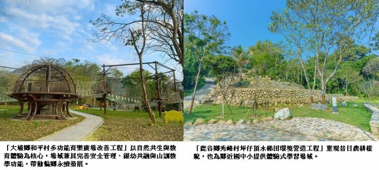 「水林鄉大溝社區活動中心前綠美化工程」利用當地詩詞、當地廟宇故事及當地特產57號番薯等元素,設計陶板意象,將故事融入地方牆面,以彩色陶板、馬賽克磚及陶磚等呈現在地故事;「水林鄉蕃薯寮媽起手式園區營造工程」將傳統農村文化意象融入場域,保留地方故事脈絡,透過景觀打造與文化符號再現,使園區成為展現社區精神的文化活動空間「大埔鄉和平村多功能育樂廣場改善工程」則重現遨遊山林間的歡樂光景,採維持地貌樣態,以最小面積構築高空體訓場與最大容積的六邊形設置停等平台,讓仿木材料與安全繩網串連出各種玩法,提供不同於都市的自然探索教育實踐;「竹崎鄉金獅社區造紙寮教育園區改善工程」透過歷史遺址再造,修復造紙寮遺址,包括石槽、石輾輪等製紙設施,重現百年造紙歷史記憶。同時結合在地文化以竹紙、摺紙為設計主軸,融入藝術裝置與意象導覽,強化地景特色,並將手作與紙藝精神延伸為藝術與文化教育體驗。