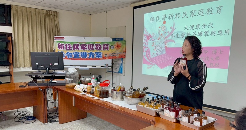 移民署中區事務大隊澎湖縣服務站於12月3日在澎湖科技大學教學大樓,辦理「時尚健康飲品新趨勢-康普茶DIY」暨家庭教育及法令宣導方案。特別邀請國立澎湖科技大學觀光休閒系教授兼研發長白如玲擔任講師,帶領學員認識康普茶的來源、發酵方法與健康價值,透過手作提升新住民健康知能與自我照顧能力,強化日常健康應用技巧。