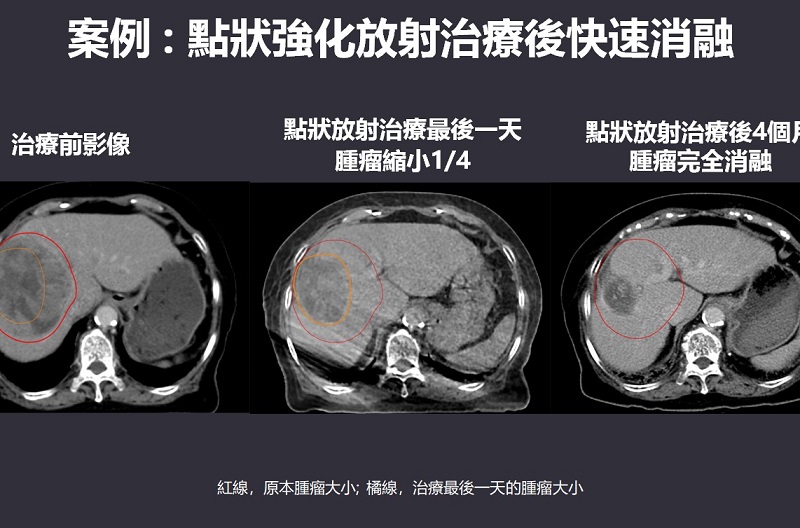 林裕為醫師分享,一位90多歲的高齡肝癌病人,腫瘤體積高達460立方公分,如同一個中型葡萄柚大小,過去治療難度高且風險高。林裕為醫師說明,當時團隊原本擔心病人體力無法承受高強度放療,但在空間分割放療技術的協助下,能將高劑量鎖定腫瘤核心、低劑量包覆周邊,並搭配免疫治療共同進行。令人驚訝的是,治療後僅兩週影像顯示腫瘤明顯縮小,四個月後幾乎消失,病人追蹤情況良好。