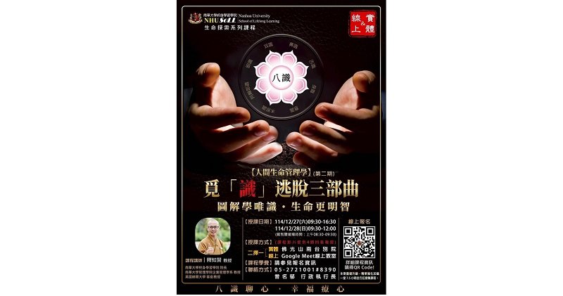 南華大學終身學習學院院長知賢以「幸福終生、終身學習」為願景,推出生命探索課程《人間生命管理學》第二期——「覓『識』逃脫三部曲」,旨在協助學員釐清煩惱來源、強化心理韌性,提升生命品質。