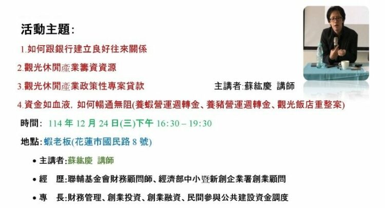 這次課程活動指導單位為花蓮縣政府、主辦單位為花蓮縣觀光休閒產業協會、協辦單位為花蓮縣議員林品仰服務處,邀請財務顧問蘇紘慶講師分享融資處理的課程,活動主題包括1.如何跟銀行建立良好往來關係2.觀光休閒產業籌資資源3.觀光休閒產業政策性專案貸款4.資金如血液,如何暢通無阻等議題,