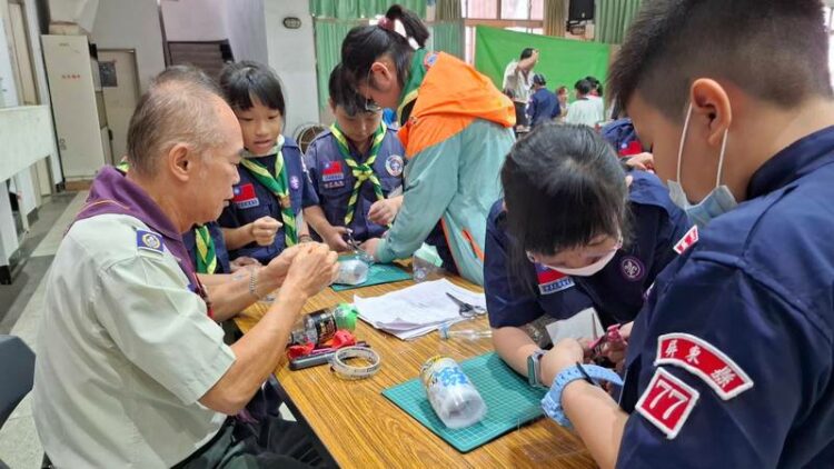 & 在各項專科章試場中,可見童軍們專注投入,認真完成每項任務。在環保與創作類專科章中,學員以回收瓶罐進行手工製作,考官逐一講解要點,孩子們全神貫注,展現十足創意與求知精神;在結繩、急救等技術場次中,童軍們展現平時扎實訓練成果,動作俐落、態度專注,獲得考官高度肯定。