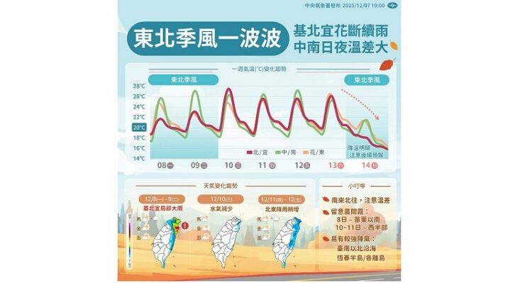 溫度方面,北部及東北部天氣稍轉涼,其他地區早晚亦涼;預測北部及東北部白天高溫約21至23度,中南部及花東高溫約25至29度,中部以北及東北部低溫約14至16度,其他地區約18、19度,局部近山區平地及沿海或空曠地區會更低,中南部日夜溫差較大。