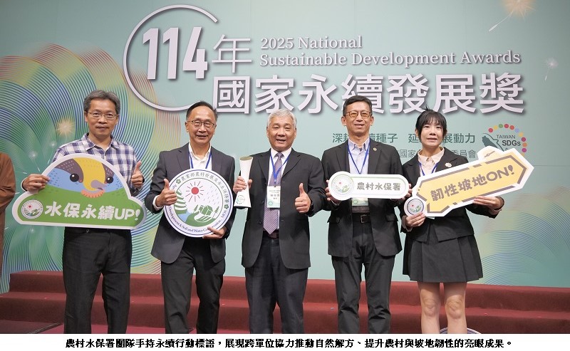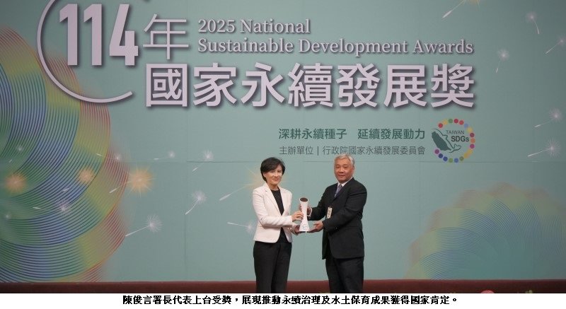 114年度國家永續發展獎頒獎典禮今(8)日下午於臺大醫院國際會議中心舉行,由行政院鄭麗君副院長親自頒獎。農業部農村發展及水土保持署以「人與自然共好—以自然解方推動集水區調適策略計畫」獲得政府機關類肯定,展現農村水保署在永續治理與自然解方推動上的重要成果。