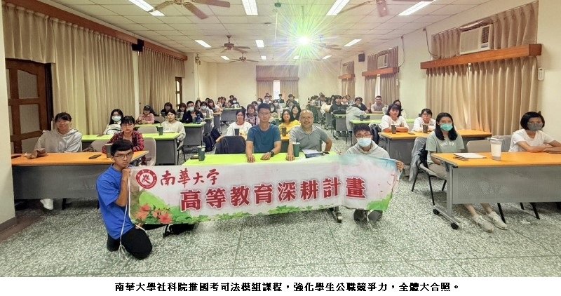 南華大學為協助學生奠定國家考試基礎能力、掌握公務體系職涯發展方向,由社會科學院開設《國考與司法專業》跨領域模組課程,整合高普考與司法特考所需之四門核心專業科目,包括「法學知識與國考英文」、「行政法」、「刑法與刑事訴訟法概要」、「民法與民事訴訟法概要」。期望透過每學期一門課的系統式學習,協助全校有志報考公職的學生提前做好國考準備,強化未來報考公職或司法途徑的專業能力與考試實力。