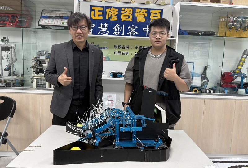 在眾多優秀隊伍中,正修資管系碩士班學生陳柏翔以「AI 自動撿羽毛球機」脫穎而出奪下資訊應用組第一名。該項作品結合 AI 影像辨識、物件追蹤、測距感測器與自主導航控制技術,能即時偵測球場上的羽毛球,自動前往撿拾並回收至指定位置,具備避障、定位與效率化作業能力,成功解決球場人工撿球耗時與不便問題。