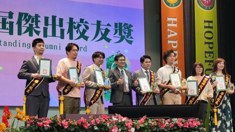 圖說:陳建宏律師(右四)以其專業成就力與母校連結力重重突圍,王昭雄校長(左四)於樹德科大28周年校慶典禮頒發「傑出校友」殊榮致賀。