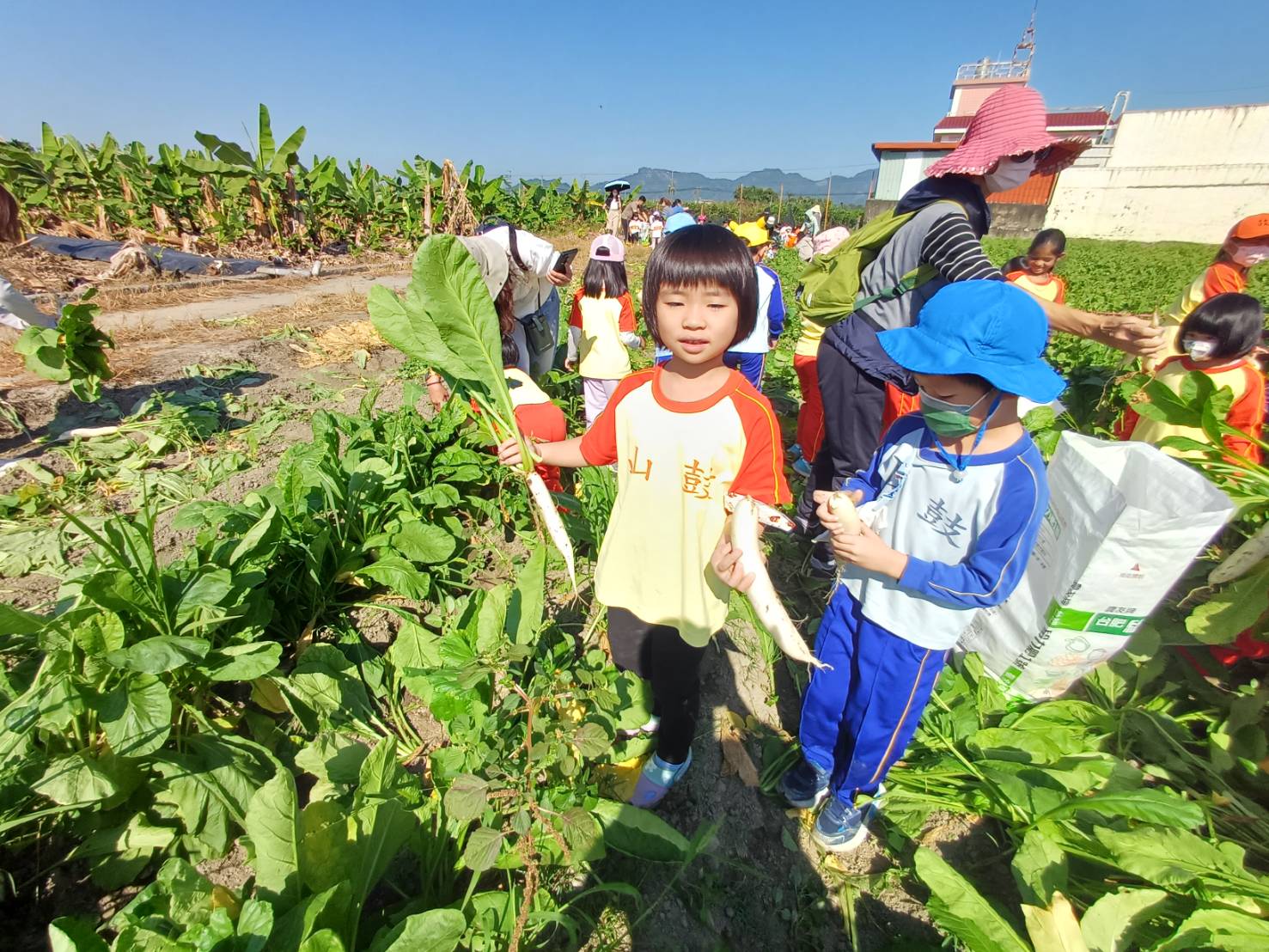 第1次實際下田參與採收的鼓山國小學生1年級的顏正皓同學說,這是他第1次下田,原來自己吃的蘿蔔與美濃的白玉蘿蔔長像與大小和形狀完全不一樣,雖然很累可是學到很多東西;鼓山國小幼兒園大班李季冰同學也說,想把自己採收的白玉蘿蔔帶回去送給媽媽加菜。