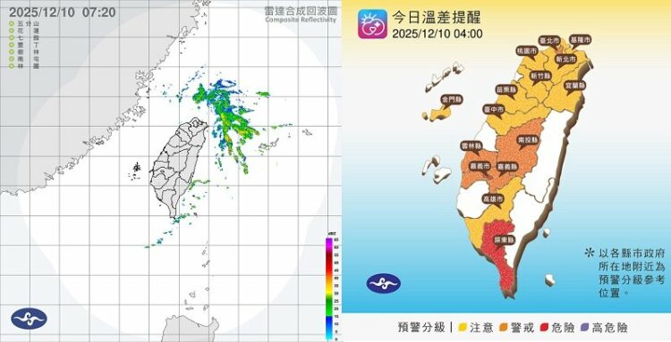 氣溫方面,東半部雲量稍多,低溫約18至20度,高溫約24至25度,西半部雲量偏少,夜間清晨易有輻射冷卻作用,低溫約在16至18度,白天高溫會來到27至29度,西半部日夜溫差大。