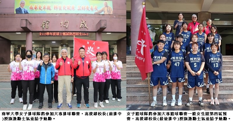 大專籃球聯賽一般女生組第四區預賽,自12月10日起在南華大學正行中心登場,身為地主隊,更希望以主場之姿展現扎實訓練成果,打出亮眼成績。國武術隊將於12月13日至14日前往文化大學參加全國大專盃武術錦標賽;女子排球隊則將於12月16日至17日在國立臺北護理健康大學出戰大專排球聯賽。為激勵運動代表隊的士氣,該校校長高俊雄分別在成均館前廣場主持授旗儀式,給予祝福與期許,並展現學校的支持與勉勵。