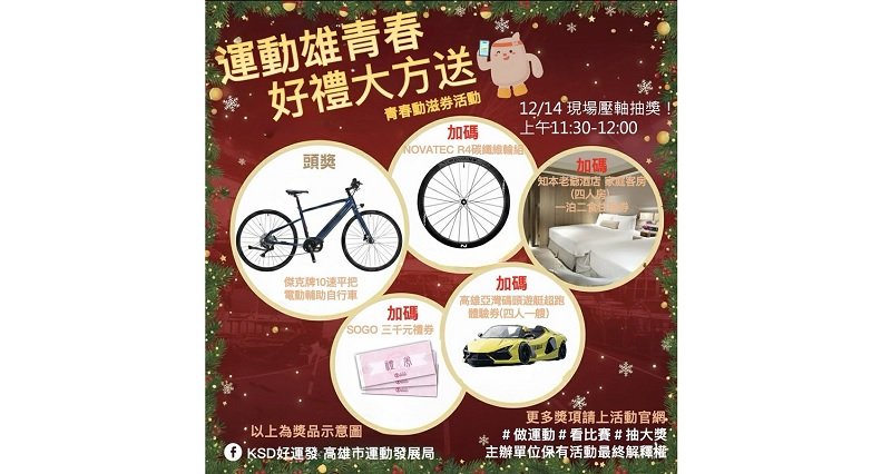 「運動雄青春 好禮大方送」壓軸抽獎12/14登場!青春動滋券高雄年底再加碼,運發局邀請市民一起動起來抽好禮!