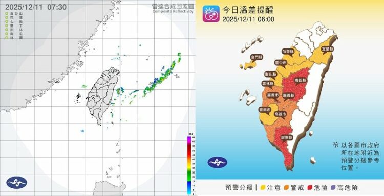 週四(11日)各地氣溫回升,中南部雲量較少,白天可達27到29度,日夜溫差大,早出晚歸記得多加件衣物,以免著涼。下午起東北季風稍增強,午後北部、東北部及東部地區轉為局部短暫雨。