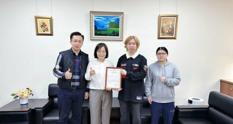 圖/義守大學「哈夫克」勇奪數發部全國 AI 解題競賽獎。(右起)會計學系吳亭葦同學、國際商務學系劉明坤同學、沈季燕副校長、會計學系謝名家教授。