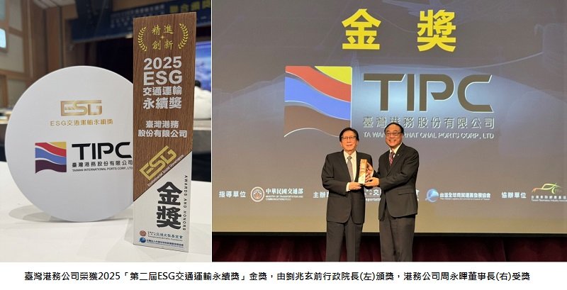 臺灣港務公司以港埠低碳轉型、社會共榮與智慧韌性為核心,持續推動港口永續發展,今(114)年以「高雄港第七貨櫃中心」的卓越永續作為,再度榮獲第二屆「ESG交通運輸永續獎」金獎肯定。今(12)日於交通部集思會議中心舉辦的盛大頒獎典禮,由臺灣港務公司周永暉董事長出席受獎,展現港務公司長年在交通運輸永續領域的創新作為與具體成果。