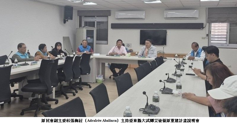 為協助原住民族部落加速恢復在丹娜絲颱風及七二八豪雨後受損的生活機能,原住民族委員會副主任委員杜張梅莊(Adralriw Abaliusu)於11、12日走訪台東縣大武鄉、太麻里鄉、台東市、關山鎮、池上鄉及長濱鄉等地,向地方說明災後復原重建計畫的核定進度及內容。