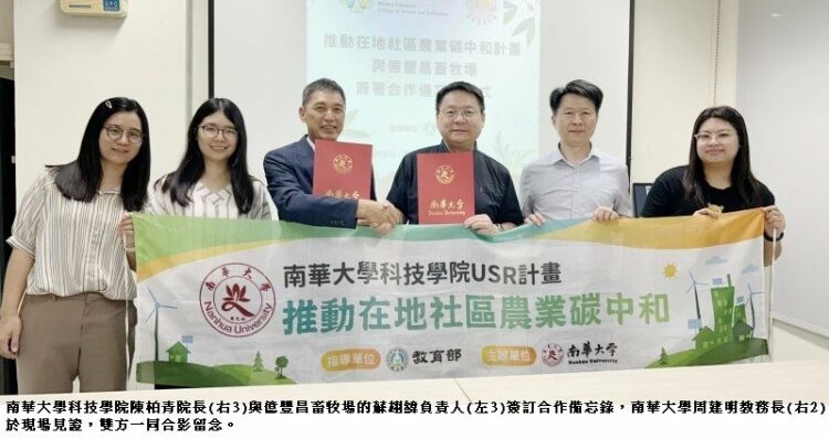 南華大學科技學院USR「推動在地社區農業碳中和」計畫於日前與雲林縣四湖鄉的「億豐昌畜牧場」正式簽署合作備忘錄,雙方將共同推動循環農業、KKF自然農法,以及在地永續示範場域建置。簽署儀式於南華大學科技學院舉行,由南華大學科技學院院長陳柏青與億豐昌畜牧場負責人蘇翃緯,共同簽署,宣示攜手打造低碳畜牧與農業永續模式。