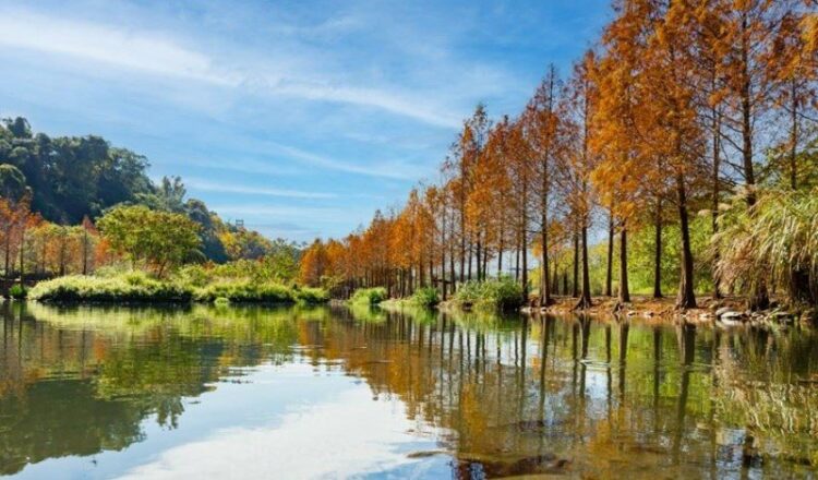大漢溪右岸以大溪水資源回收中心為起點,結合月眉人工濕地、山豬湖生態親水園區作為環境教育推動基地,而月眉人工濕地兼具水質淨化、生態棲地復育、活化景觀與節能減碳等功能,濕地週邊種植了近370棵落羽松,今年預計在12月下旬落羽松開始變色,紅黃交織的樹葉搭配藍天白雲倒映在水面上,彷彿置身歐洲一般,每年吸引大批民眾前來打卡取景,不需任何門票即可欣賞到絕世美景,是超熱門的打卡景點!